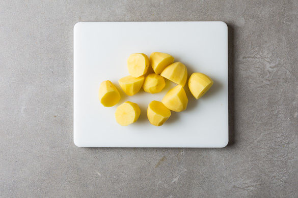 In einem mittelgroßen Topf ausreichend gesalzenes Wasser für die Kartoffeln zum Kochen bringen. Die Kartoffeln schälen und je nach Größe ggf. halbieren. Sobald das Wasser kocht, die Kartoffeln hineingeben und in ca. 20–25Min. bissfest kochen. In ein Sieb abgießen und abkühlen lassen.