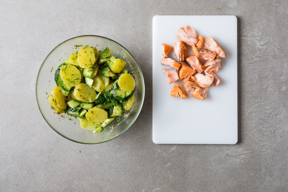 Ein richtig leckerer Kartoffelsalat ist viel zu gut, um nur als BBQ-Beilage oder traditionelles Weihnachtsessen zu dienen. Mit frischer Gurke und Dill ergänzt und mit saftigem Stremellachs serviert wird er im Nu zum Star des Abends. Unwiderstehlich!