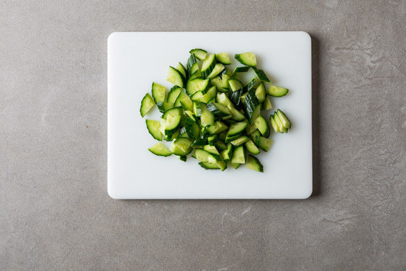 Die Gurke längs vierteln und quer in ca. 0,5cm dünne Scheiben schneiden.