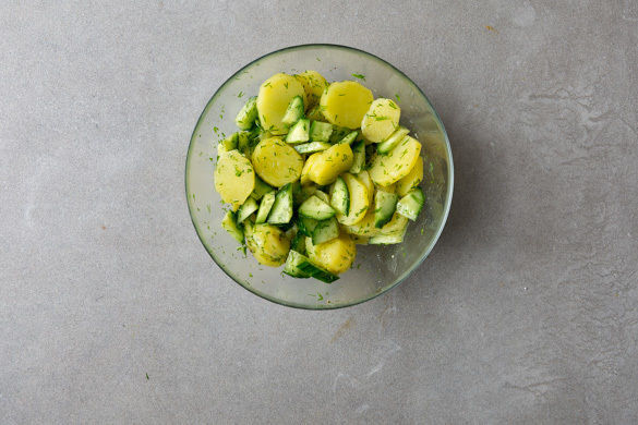 Die abgekühlten Kartoffeln in ca. 1cm dicke Scheiben schneiden und mit den Gurken, dem Dill, 1EL Senf, 1EL Olivenöl und 1EL Essig vermengen. Den Salat ggf. mit mehr Essig abschmecken.