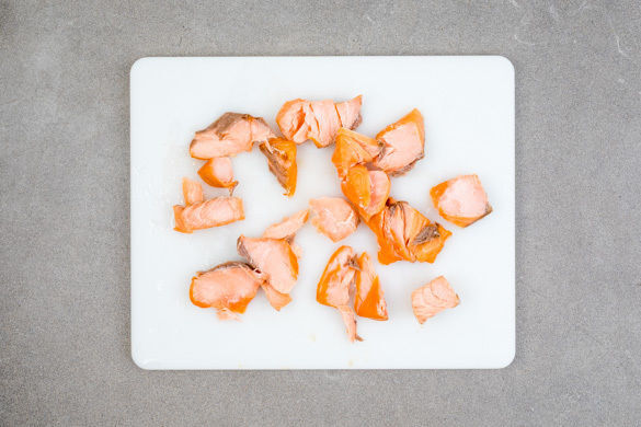 Die Haut entfernen und den Lachs mit einer Gabel grob zerteilen, evtl. vorhandene Gräten mit einer Pinzette entfernen.