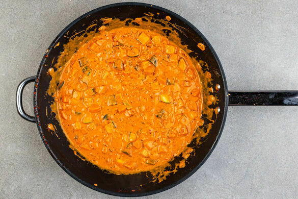Das Tomatenmark zum Gemüse in die Pfanne geben und 1–2Min. mitgaren. Dann die Gewürzmischung, das restliche Brühgewürz, die Sahne und das Pastawasser einrühren und die Sauce bei niedriger Hitze 3–4Min. einköcheln lassen.
