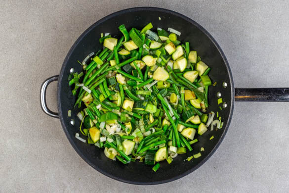 Den Lauch längs halbieren und in quer in feine Streifen schneiden. Die Zucchini längs vierteln und in 1–2cm große Würfel schneiden. Die Enden der grünen Bohnen entfernen. Den Lauch, die Zucchini und die grünen Bohnen in der Pfanne mit 2EL Olivenöl bei mittlerer bis starker Hitze 6–8Min. braten.
