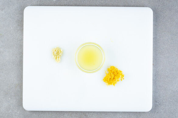 Ggf. den Grill vorheizen. Die Zitronenschale abreiben, dann die Zitrone halbieren und auspressen. Den Knoblauch schälen und fein würfeln.