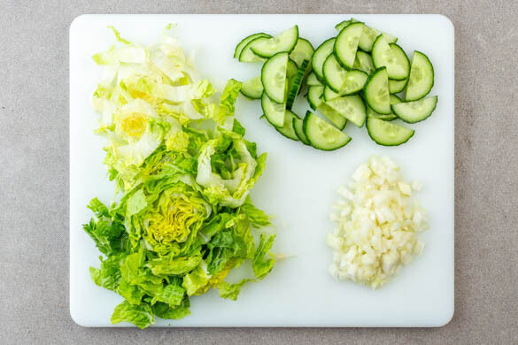 Die Zwiebel schälen, halbieren und sehr fein würfeln. Das Strunkende dünn abschneiden und den Salat quer in feine Streifen schneiden. Die Gurke längs halbieren und in dünne Streifen schneiden.