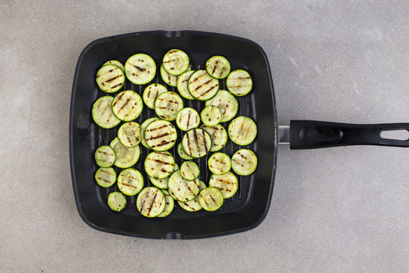 Die Zucchinischeiben mit 1EL Olivenöl vermengen und in einer Grillpfanne oder normalen Pfanne bei starker Hitze auf jeder Seite 1–2Min. grillen, dann mit 1 kräftigen Prise Salz und 1 Prise Pfeffer würzen. Tipp: Die Zucchini ggf. in mehreren Durchgängen grillen, sodass alle Scheiben schön bräunen können.