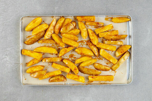 Den Backofen auf 240°C (220°C Umluft) vorheizen. Die Kartoffeln samt Schale in fingerdicke, pommesartige Streifen schneiden. Auf zwei mit Backpapier ausgelegten Backblechen mit 1–2TL Paprikapulver, 2EL Olivenöl und 1TL Salz vermengen, dann im Ofen 20–25Min. backen, bis die Pommes goldbraun sind. Noch 5–10Min. bei leicht geöffneter Tür im Ofen lassen, so werden sie extra knusprig.