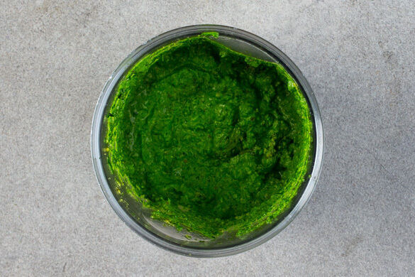 1TL Zitronensaft, 2EL Olivenöl, 2EL Wasser, ½TL Salz und 1 Prise Pfeffer dazugeben und alles mit einem Stabmixer in 1–2Min. zu einem glatten Pesto pürieren. Dann den Spinat portionsweise mitpürieren und das Pesto mit Salz und Pfeffer abschmecken.
