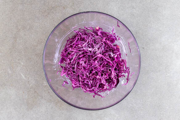 Den Rotkohl in feine Streifen schneiden. 2EL Mayonnaise, 1EL hellen Essig, 1EL Wasser, 1 Prise Zucker und je 1 kräftige Prise Salz und Pfeffer verrühren und mit dem Rotkohl verkneten, bis er weich wird. Dabei am besten Küchenhandschuhe tragen.