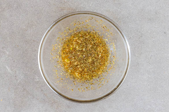 Die Orange halbieren und auspressen. ½TL Oregano und ½TL Kreuzkümmel-Koriander-Gewürzmischung vermengen. Den Knoblauch schälen, sehr fein würfeln oder durch eine Knoblauchpresse drücken und unterrühren.