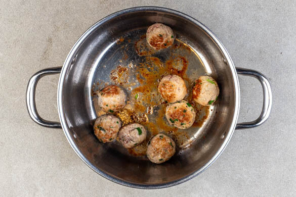 Die Hackbällchen mit 1EL Pflanzenöl in einem großen Topf bei starker Hitze in 3–4Min. unter gelegentlichem Wenden goldbraun und gar braten. Aus dem Topf nehmen und beiseitestellen, dabei den Topf und den Bratensatz aufbewahren.