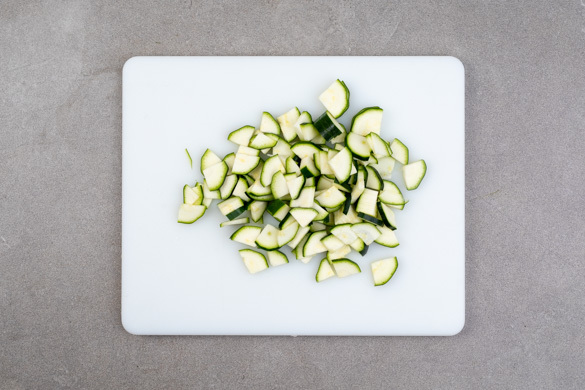 Die Zucchini längs vierteln und in dünne Scheiben schneiden.