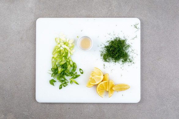 Die Lauchzwiebeln schräg in feine Ringe schneiden. Die Dillspitzen von den Stängeln zupfen und fein schneiden. Die Zitrone halbieren und eine Hälfte auspressen, die andere Hälfte in Spalten schneiden.