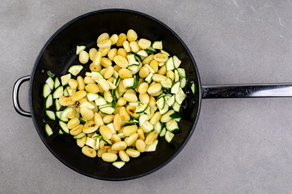 Die Gnocchi in einer großen Pfanne mit 3EL Olivenöl bei starker Hitze in 5–8Min. knusprig anbraten. Dann die Zucchinischeiben hinzugeben und 1–2Min. mitbraten.