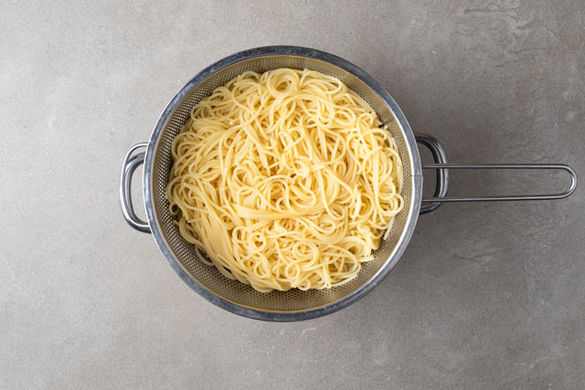 Die Spaghetti in das kochende Wasser geben und in 7–9Min. bissfest kochen. In ein Sieb abgießen und abtropfen lassen.