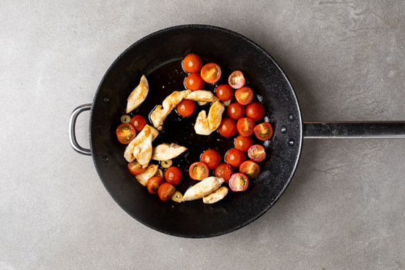 Die Kirschtomaten halbieren. Den Knoblauch schälen und in feine Scheibchen schneiden.
