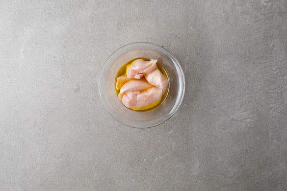 In einem großen Topf ausreichend gesalzenes Wasser für die Pasta zum Kochen bringen. Das Fleisch mit etwas Küchenkrepp trocken tupfen, in 2–3cm breite Streifen schneiden und mit 1–2EL Olivenöl vermengen.