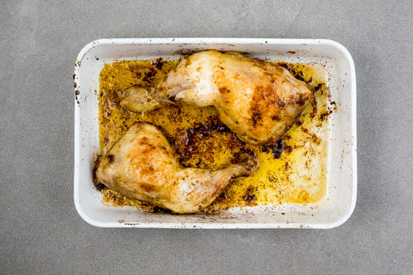Die Hähnchenkeulen mit etwas Küchenkrepp trocken tupfen, dann mit 1–2EL Pflanzenöl, der Gewürzmischung und etwas Salz gut einreiben. In eine Auflaufform geben und 35–40Min. im Ofen knusprig backen. Dabei das Fleisch ab und an wenden, damit es gleichmäßig gar wird.