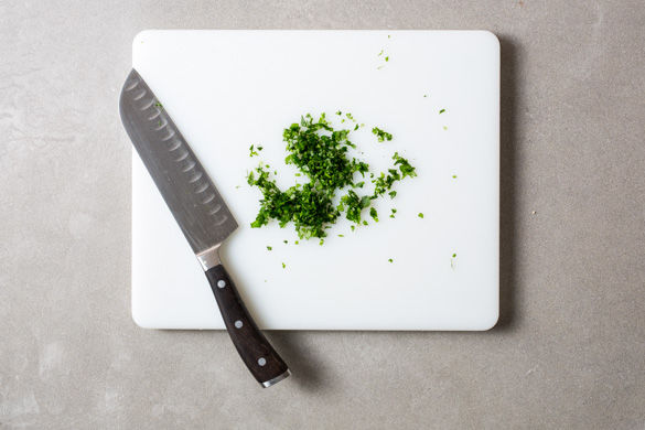 Die Petersilienblätter von den Stängeln zupfen und fein hacken.