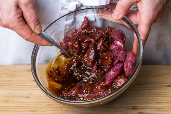 Das Fleisch aus der Marinade nehmen und in einer großen Pfanne bei mittlerer bis starker Hitze 2–3Min. scharf anbraten, bis das Fleisch knusprig ist. Mit der Marinade ablöschen und weitere 1–2Min. braten.
