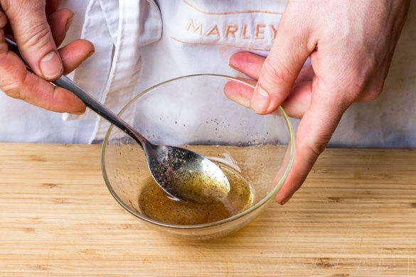 Das Sesamöl mit 1–2TL Olivenöl, 1–2TL Essig sowie Salz und Pfeffer zu einem Dressing verrühren.