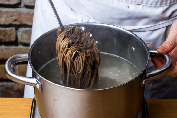 Die Sobanudeln im kochenden Wasser in 3–5Min. bissfest garen. In ein Sieb abgießen und abtropfen lassen.