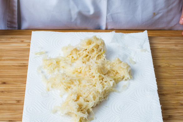 Den Backofen auf 200°C Umluft (220°C Ober-/Unterhitze) vorheizen. Das Sauerkraut in ein Sieb abgießen und möglichst viel Flüssigkeit ausdrücken, ggf. mit einem sauberen Küchentuch oder Küchenkrepp weiter trocknen.