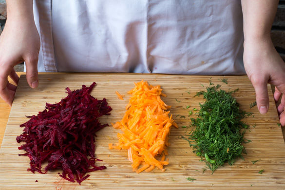 Inzwischen die Rote Bete und die Karotte schälen und mit einer Küchenreibe grob raspeln. Tipp: Da Rote Bete stark färbt, am besten mit Handschuhen und Schürze arbeiten. Die Dillspitzen von den harten Stängeln zupfen und fein schneiden.