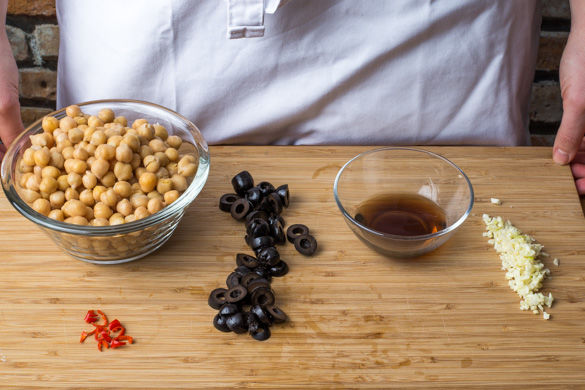 Inzwischen die Kichererbsen in ein Sieb abgießen. Den Knoblauch schälen und fein würfeln. Die Oliven in Ringe schneiden. Die Chili in feine Streifen schneiden. Tipp: Wer es nicht so scharf mag, entfernt die Kerne oder lässt die Chili einfach weg.