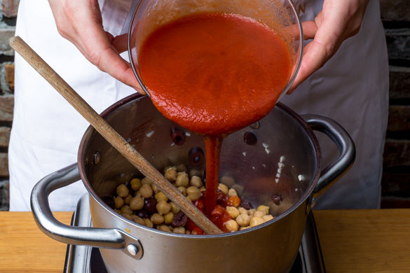 Die abgetropften Kichererbsen und ca. 3/4 des Knoblauchs in einem mittelgroßen Topf mit 1EL Olivenöl bei mittlerer Hitze 2–3Min. anschwitzen. Mit den passierten Tomaten ablöschen und mit der Gewürzmischung abschmecken. Bei niedriger Hitze 8–10Min. köcheln lassen. Nach Wunsch mit den Chilistreifen verfeinern.