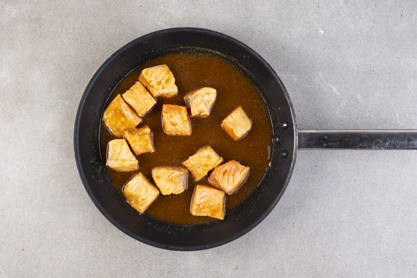 Den Fisch mit etwas Küchenkrepp trocken tupfen, die Haut vorsichtig entfernen und den Fisch in 10–12 gleich große Stücke schneiden. evtl. vorhandene Gräten mit einer Pinzette entfernen. Die Fischstücke mit der Misopaste vermengen.