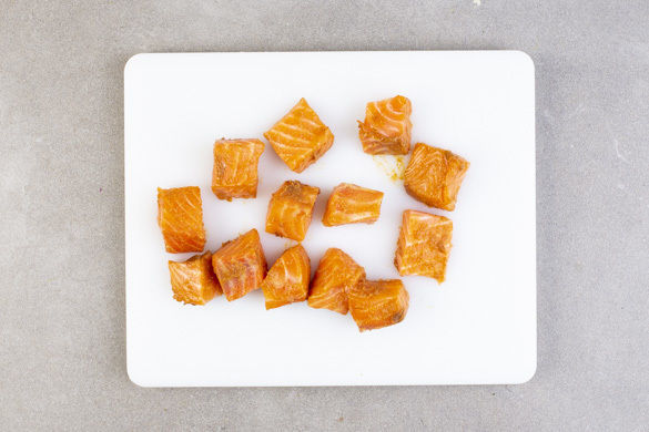 Den Fisch mit etwas Küchenkrepp trocken tupfen, die Haut vorsichtig entfernen und den Fisch in 18–20 gleich große Stücke schneiden. evtl. vorhandene Gräten mit einer Pinzette entfernen. Die Fischstücke mit der Misopaste vermengen.