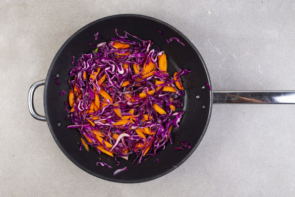 Den Rotkohl und die Karotten in einer weiteren großen Pfanne mit 2–3EL Pflanzenöl bei mittlerer Hitze 3–4Min. knackig anbraten. Die Udon-Nudeln 1–2Min. unterrühren, dann mit Limettenabrieb, -saft, Salz und Pfeffer würzen. Die Nudelpfanne auf Teller verteilen und mit der Brühe begießen. Den Fisch darauf anrichten und mit den Lauchzwiebeln garniert servieren.