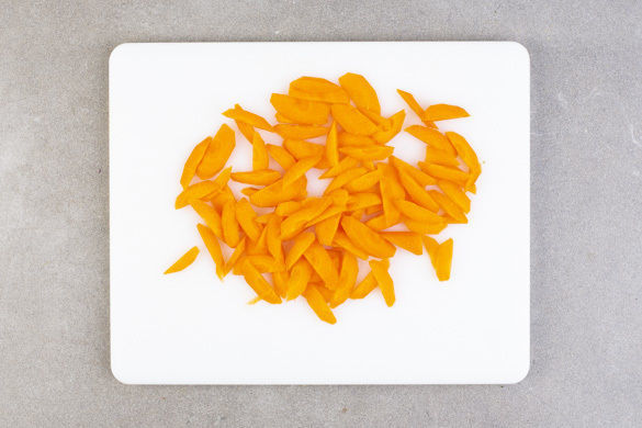 Die Karotten schälen, längs halbieren und in möglichst dünne, längliche Scheiben schneiden.