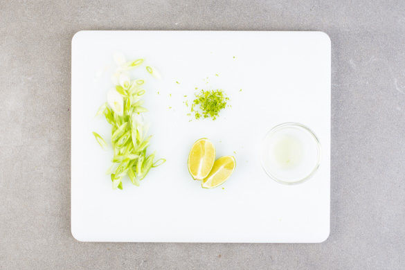 Die Lauchzwiebeln schräg in feine Ringe schneiden. Die Limettenschale abreiben und die Limetten halbieren, zwei Hälften auspressen, die anderen Hälften in Spalten schneiden.