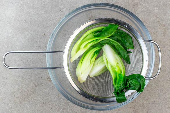Den Pak Choi in das kochende Wasser geben und 2–4Min. blanchieren, bis ein Messer leicht hindurchgleitet. In ein Sieb abgießen und abtropfen lassen, dann vorsichtig trocken tupfen.