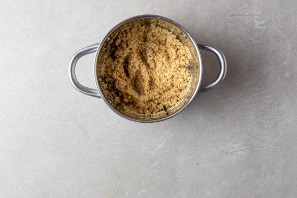 In einem mittelgroßen Topf 650ml leicht gesalzenes Wasser zum Kochen bringen. Die Quinoa in einem feinmaschigen Sieb mit warmem Wasser abspülen, in das kochende Wasser geben und 10–12Min. abgedeckt bei niedriger bis mittlerer Hitze sanft köcheln lassen. Vom Herd nehmen und bis zum Servieren warm halten. Tipp: Wer mag, kann die Quinoa mit 1–2TL Butter und 1 Prise Pfeffer verfeinern.