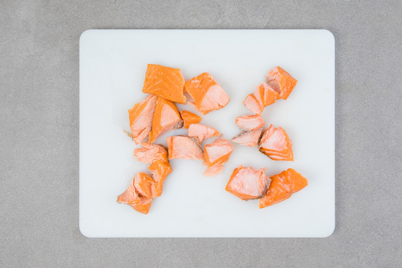 Die Haut entfernen und den Lachs mit einer Gabel grob zerteilen, evtl. vorhandene Gräten mit einer Pinzette entfernen.