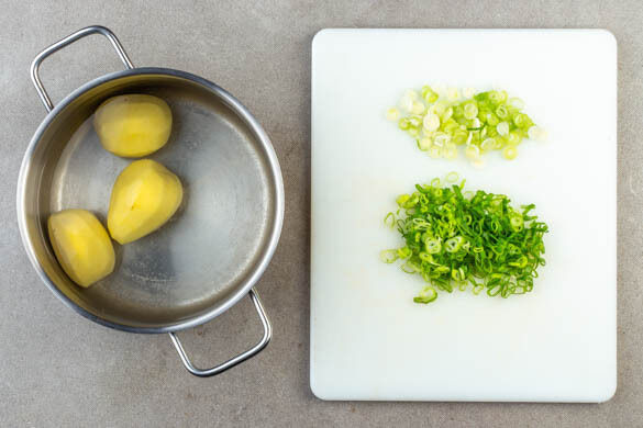 Den Backofen auf 200°C (180°C Umluft) vorheizen. Die ½ der Kartoffeln schälen, mit ausreichend leicht gesalzenem Wasser in einem mittelgroßen Topf zum Kochen bringen und in 15–20Min. gar kochen. Inzwischen die Lauchzwiebeln in feine Ringe schneiden. Die Kartoffeln in ein Sieb abgießen, zurück in den Topf geben und abkühlen lassen.