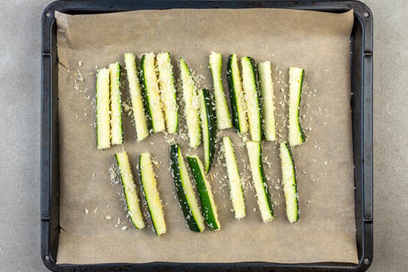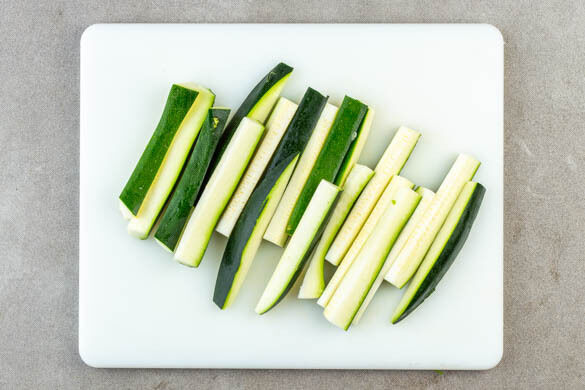 Die Zucchini einmal längs und einmal quer halbieren, dann der Länge nach in fingerdicke Stifte schneiden. Mit 1 Prise Salz bestreuen und 4–5Min. ziehen lassen. Dann die ausgetretene Flüssigkeit gut abtupfen.