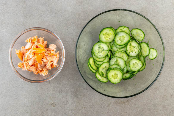 Den Dill abzupfen und fein schneiden. Die Gurke in dünne Scheiben schneiden und mit ½EL Pflanzenöl, ½EL Essig und je 1 Prise Zucker, Salz und Pfeffer vermengen, dann die ½ des Dills untermischen. Die Haut entfernen und den Lachs mit einer Gabel grob zerteilen, evtl. vorhandene Gräten mit einer Pinzette entfernen.