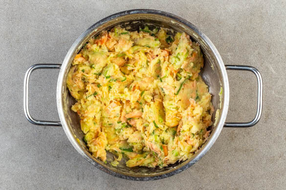 Die Kartoffeln zu einem Püree stampfen und mit den Lauchzwiebeln, dem übrigen Panko-Paniermehl, 2EL Mehl und dem Lachs vermengen. 1 Ei verquirlen und mit je 1 Prise Salz und Pfeffer gründlich unter die Kartoffelmasse kneten. Nach Bedarf etwas mehr Mehl hinzufügen, falls die Kartoffelmasse zu klebrig ist. Mit angefeuchteten Händen 6 flache Küchlein formen.