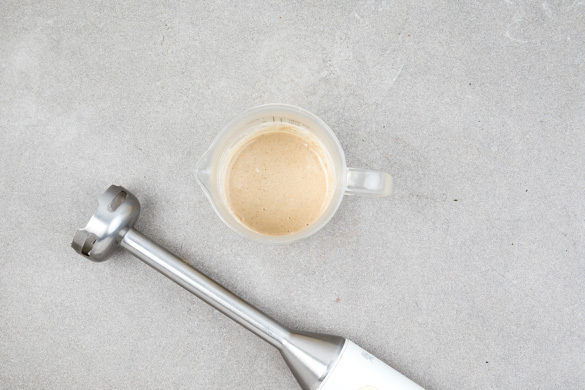 Den gebackenen Knoblauch schälen und mit dem Tahini, 3–4EL Wasser und 1 Prise Salz in einem hohen Gefäß mit einem Stabmixer zu einem leicht dickflüssigen Dressing pürieren, dabei ggf. löffelweise Wasser zugeben. Die Zitronenschale abreiben, dann die Zitrone halbieren und auspressen. Das Dressing mit Zitronensaft und Salz abschmecken.