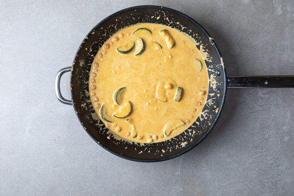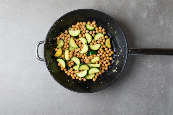 Den Knoblauch in derselben Pfanne mit 1EL Pflanzenöl bei mittlerer Hitze ca. 30Sek. anbraten, dann die Zucchinischeiben dazugeben und mit je ½TL Salz und Pfeffer würzen. Die Zucchini 4–5Min. leicht bräunlich anbraten. Die Kichererbsen unterrühren und 1–2Min. mitbraten.