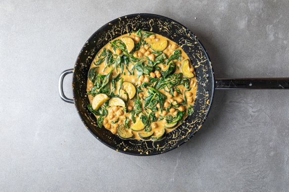 Heute gönnst du dir ein cremiges Currygericht aus der indischen Küche mit viel frischem Gemüse und feinen, nussigen Kichererbsen, die für den besonderen Biss sorgen. Verfeinert wird alles mit gerösteten Mandelblättchen und dazu reichst du locker-aromatischen Jasminreis. Lass es dir schmecken!