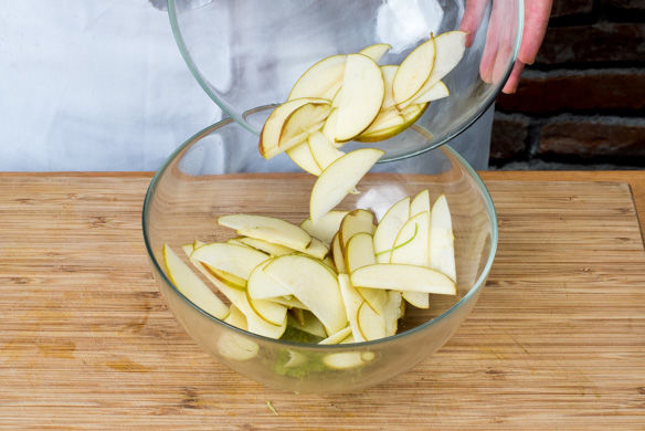 Die Limettenschale abreiben, dann die Limette halbieren und auspressen. Den Apfel vierteln, entkernen und in dünne Scheiben schneiden. Die Apfelscheiben mit dem Limettensaft und -abrieb vermengen.