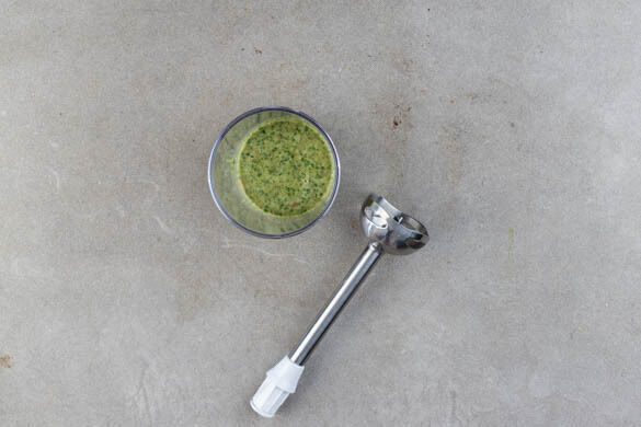 Den Koriander samt Stängeln und die Chilischote grob schneiden. Den Knoblauch schälen. ⅔ des Korianders, die Chilischote nach gewünschtem Schärfegrad, den Knoblauch, die Sardellenfilets samt Öl und 200ml kaltes Wasser in ein hohes Gefäß geben und mit einem Stabmixer fein pürieren.