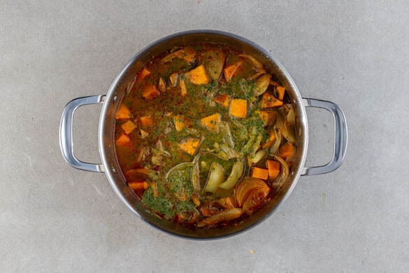 Die Gewürzmischung und die Fenchelsamen in den Topf rühren und ca. 1Min. mitbraten. Dann 1,2L heißes Wasser angießen und aufkochen. Den Eintopf abgedeckt bei mittlerer bis niedriger Hitze 6–10Min. köcheln lassen, bis die Süßkartoffeln gar sind.