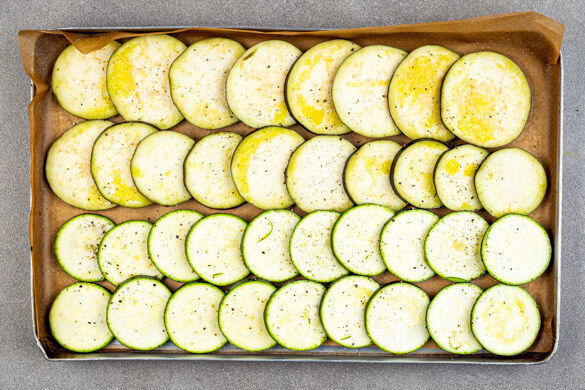 Den Backofen auf 240°C (220ºC Umluft) vorheizen. Die Rosinen mit warmem Wasser übergießen und einweichen lassen. Die Aubergine und die Zucchini quer in ca. 0,5cm dicke Scheiben schneiden.