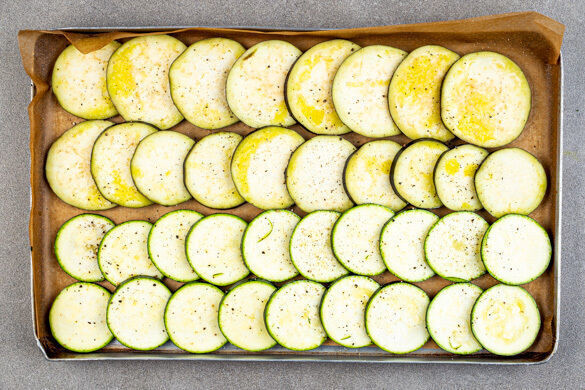 Den Backofen auf 240°C (220ºC Umluft) vorheizen. Die Rosinen mit warmem Wasser übergießen und einweichen lassen. Die Auberginen und die Zucchini quer in ca. 0,5cm dicke Scheiben schneiden.